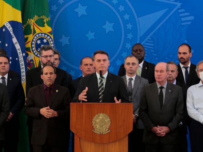Cercado pelos seus principais ministros, o presidente Jair Bolsonaro fez no fim da tarde dessa sexta-feira (24), um pronunciamento em que falou sobre a saída de seu ex-ministro da Justiça e Segurança Pública, Sergio Moro, que mais cedo justificou a saída alegando que o presidente, além de querer trocar o diretor-geral da PF e superintendentes, também