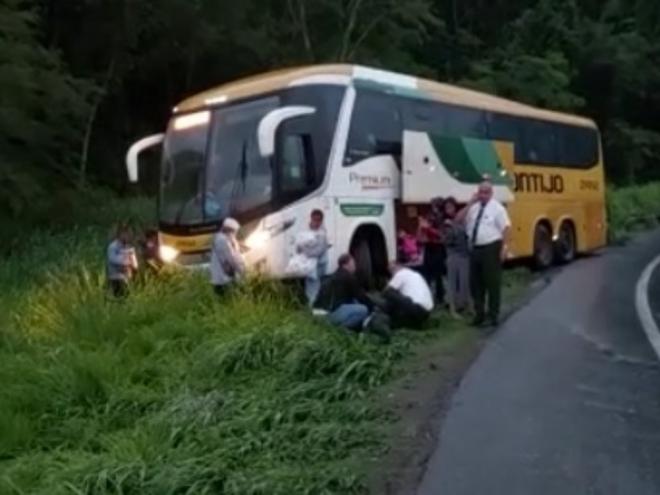 Um ônibus que trafegava sentido a Belo Horizonte saiu da pista e parou na canaleta à margem da BR-381 no trecho da rodovia em João Monlevade, na manhã desta quinta-feira
