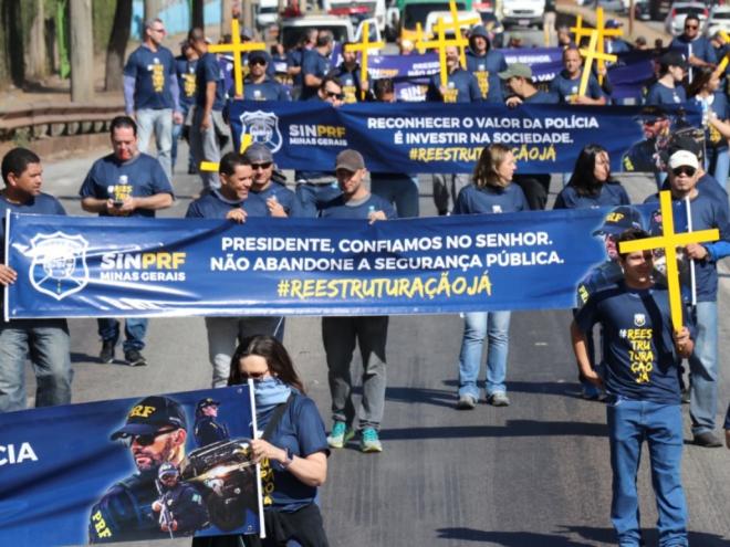 Policiais rodoviários federais realizaram uma mobilização na BR-381, em Contagem, na região metropolitana de Belo Horizonte, pedindo a reestruturação de carreira