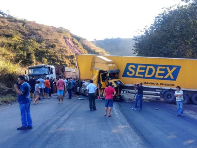 Três pessoas saíram com ferimentos leves de um acidente envolvendo duas carretas no km 317 da BR-381, em Nova Era, no fim da tarde de terça-feira