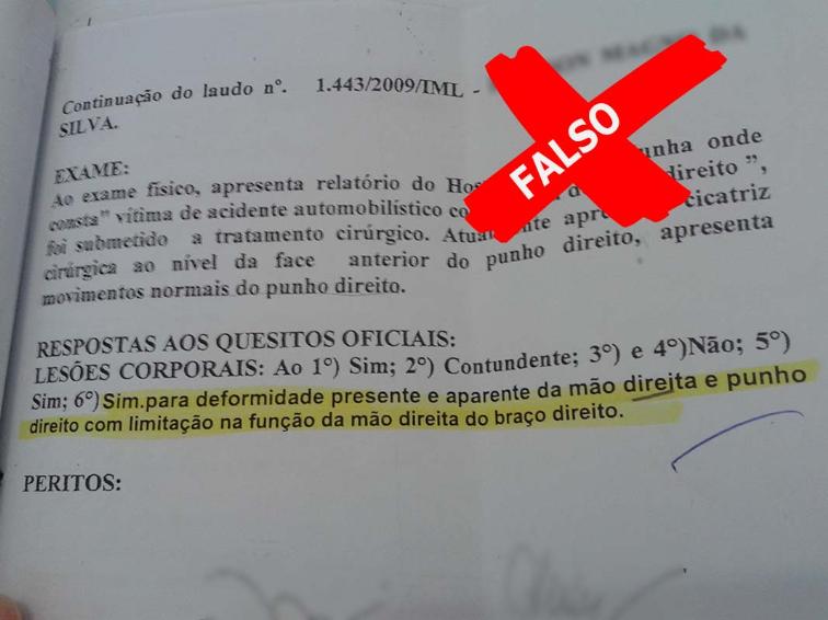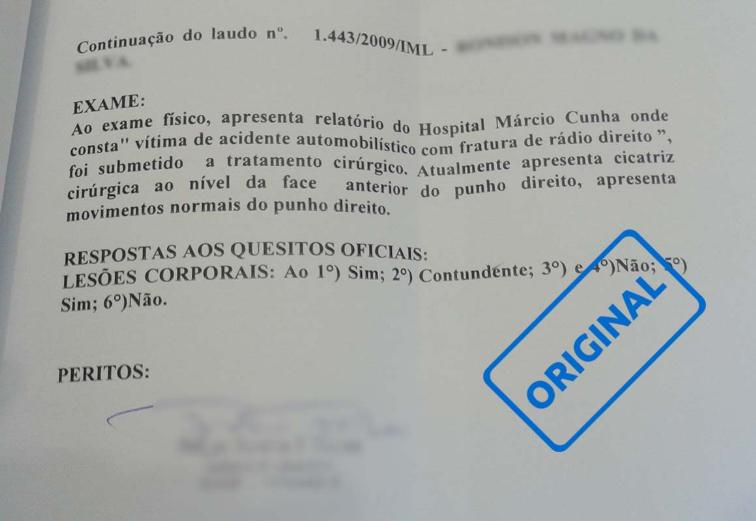 A investigação apurou que a via original do auto de corpo de delito do paciente deixou claro que a lesão da vítima não resultou em invalidez permanente de sua mão direita. A adulteração foi realizada na resposta ao quesito 6º, que indaga se, da lesão resultou debilidade permanente de membro, sentido ou função. No documento adulterado, a resposta era sim, ou seja, que do acidente havia a sequela da invalidez permanente da mão. É uma adulteração gritante”, detalhou o delegado de Polícia Civil responsável pelo fechamento do inquérito, Gilmaro Alves Ferreira.