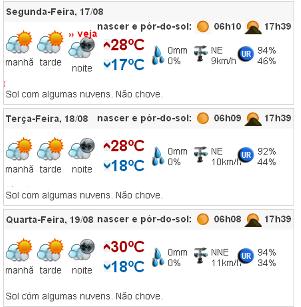 A previsão é que a segunda-feira seja de céu parcialmente nublado a nublado e temperatura entre 28 e17 graus.