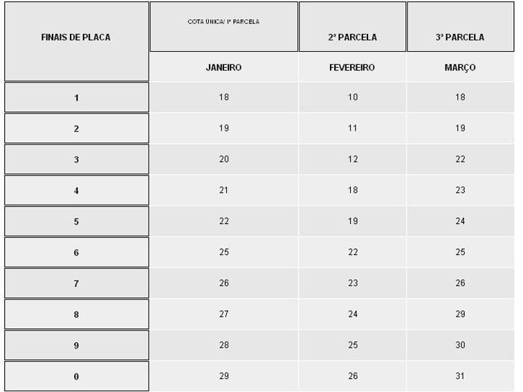 A primeira parcela, ou parcela única, vence no dia 18 de janeiro para os veículos com placa com final 1. A escala de vencimentos prossegue até o dia 29 do mesmo mês, obedecendo sempre o final de placa do veículo. Pagando à vista, o contribuinte terá um desconto de 3%. O pagamento também pode ser parcelado em até três vezes (janeiro, fevereiro e março), sem direito ao desconto. O valor mínimo para pagamento do IPVA em parcelas iguais e consecutivas é de R$90,00.