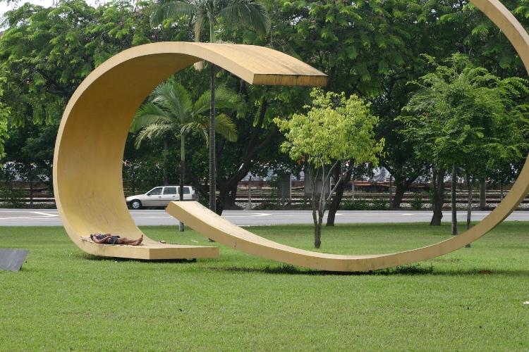 Desconhecido tirou uma boa soneca sob a escultura da artista plástica Tomie Ohtake, em frente à entrada do escritório central da Usiminas
