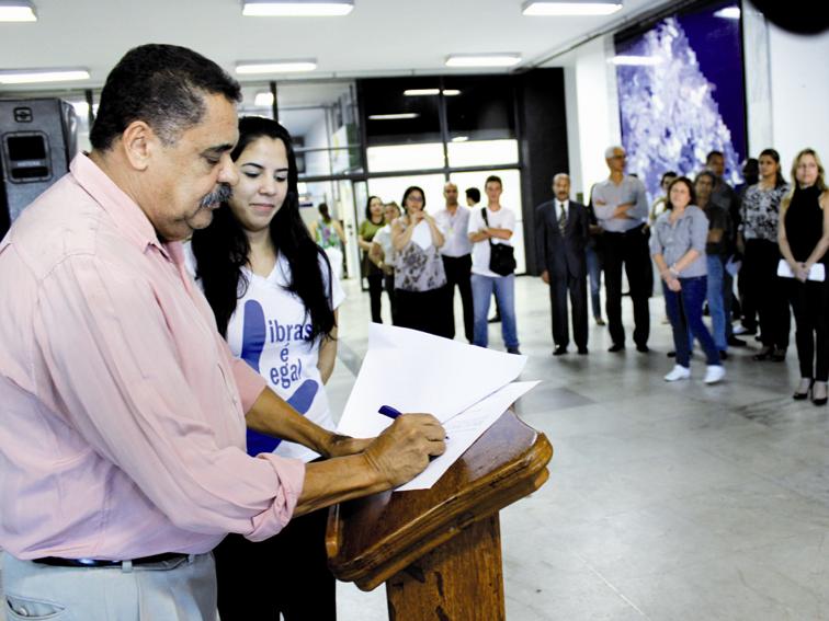 Durante a solenidade de nomeação, um grupo de alunos da Escola Municipal Altina Gonçalves, do bairro Iguaçu, apresentaram um poema com o tema: Você precisa ser surdo para entender”.