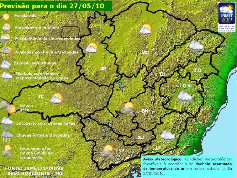 Uma massa de ar de origem Polar, que segue na retaguarda da frente ocasiona acentuado declínio da temperatura em todo o Estado. A Informação é do 5º Distrito de Meteorologia em Belo Horizonte.