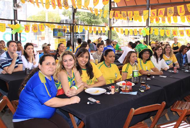Sem tempo para ir assistir ao jogo em casa, muitos empregados se reuniram em restaurantes próximo do trabalho. E foi assim que um grupo de amigas da empresa Djafer animou o almoço para acompanhar o jogo. A vendedora Lucimar Brande, 33, revela que a improvisação não tirou a alegria do grupo.