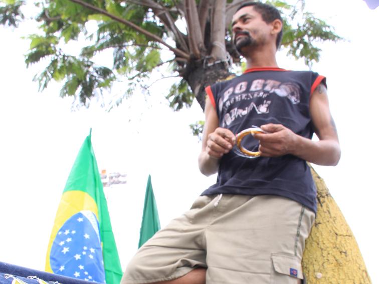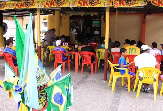 O artesão Helenildo Oliveira Silva, 39, veio de Governador Valadares para vender suas bijouterias. Com a Copa, Helenildo começou a fabricar brincos com estampas do Brasil para melhorar as vendas, e mesmo na hora do jogo não parou de trabalhar. A gente vê o pouquinho que der quando não estiver faturando”, conta.