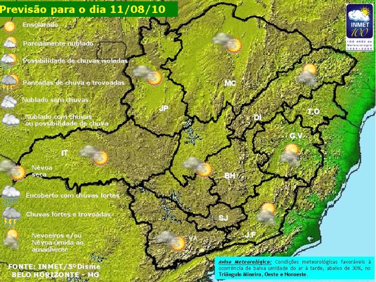 À noite, as temperaturas permanecem amenas e faz frio principalmente no Centro-Sul mineiro, mas no período mais quente do dia sobem e faz calor de até 34ºC em algumas localidades do Triângulo e Noroeste, onde umi-dade do ar fica baixa e com índices em torno dos 25% à tarde.