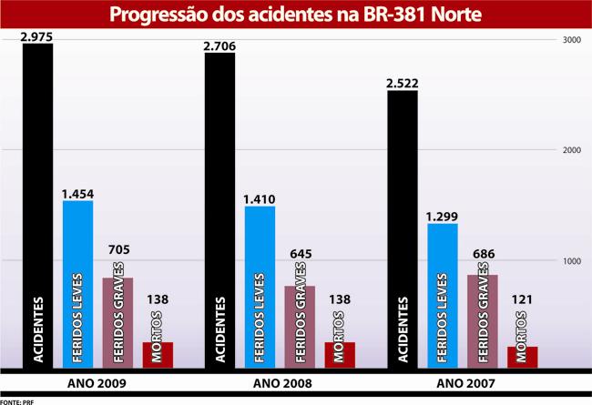 Enquanto ganha destaque no discurso dos candidatos às eleições de 2010, a BR-381 segue como palco de tragédias. Até a noite de quarta-feira (18), foram contadas duas mortes em dois acidentes, um na terça-feira no KM 310, em que morreu o morador de Antonio Dias, Sebastião Fabiano de Souza, de 59 anos. O carro em que viajava invadiu a contramão e bateu em uma carreta. Outro acidente ocorreu no KM-399, em Itabira, quando o motorista Jorge N. da Silva, de 36 anos, forçou uma ultrapassagem e colidiu com uma carreta.