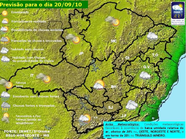 As temperaturas diurnas permanecerão estáveis, mas pode ultrapassar os 35°C no Noroeste, Norte e Triângulo Mineiro. Há condições favoráveis para formação de nevoeiro ao amanhecer em toda faixa Leste do Estado.