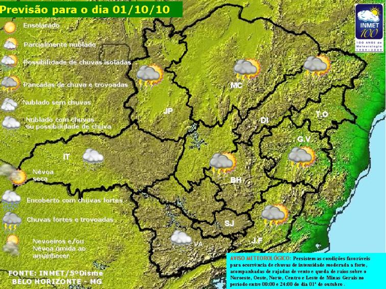 Persistem as condições favoráveis para ocorrência de chuvas de intensidade moderada a forte, acompa-nhadas de rajadas de vento e queda de raios no Noroeste, Oeste, Norte, Centro e Leste de Minas Gerais no período entre 0h e 24h deste dia 1º de outubro.