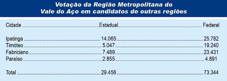 DA REDAÇÃO Na eleição do dia 3 de outubro passado os eleitores dos quatro municípios da Região Metropolitana do Vale do Aço (RMVA) despejaram 29.456 votos em candidatos a deputado estadual de outras regiões e 73.344 votos em candidatos a deputado federal de fora. Os números seriam suficientes para eleger pelo menos mais um deputado federal ou mais um deputado estadual, a depender da legenda. As informações foram tiradas do resultado oficial do Tribunal Superior Eleitoral.
