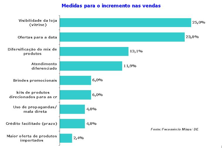 Para impulsionar as vendas em 2010, a maioria dos lojistas incrementou o visual das vitrines. Para 25%, a visibilidade da loja é fundamental para o sucesso das vendas. Outros 23,8% optaram por ofertas especiais para a data. A diversidade dos produtos é importante para 13,9% e atendimento diferenciado é citado por 11,9%.