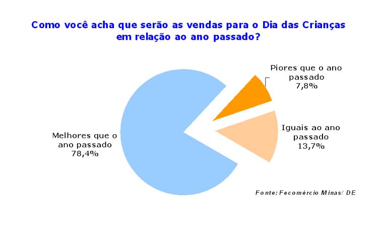 Na pesquisa 78,4% dos entrevistados disseram esperar que as vendas do Dia das Crianças este ano sejam melhores que as de 2009, quando o País ainda sentia efeitos da crise financeira internacional. Outros 13,7% responderam acreditar em vendas iguais às do ano passado e apenas 7,8% acreditam que as vendas serão piores. Entre os que acreditam que as vendas serão melhores, 63,2% apostam que o aumento nas vendas será de 10% a 20% maior do que em relação ao ano passado.
