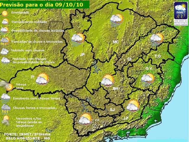 Dessa forma, apenas no norte, leste, nordeste e noroeste de Minas o tempo ainda fica com predomínio de nuvens e há possibilidade de chuva rápida e de fraca intensidade.