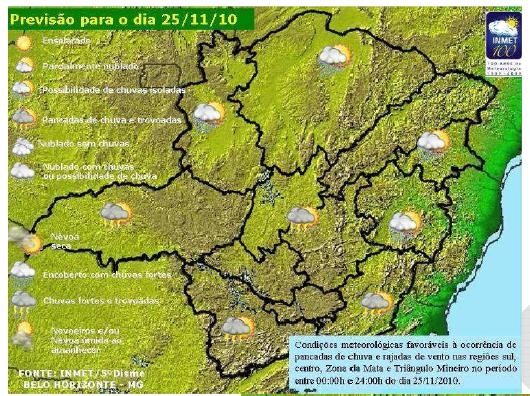 O 5º Distrito de Meteorologia alerta sobre condições favoráveis à ocorrência de pancadas de chuva e rajadas de vento nas regiões Sul, Centro, Zona da Mata e Triângulo Mineiro no período entre 00h e meia noite desta quinta-feira.