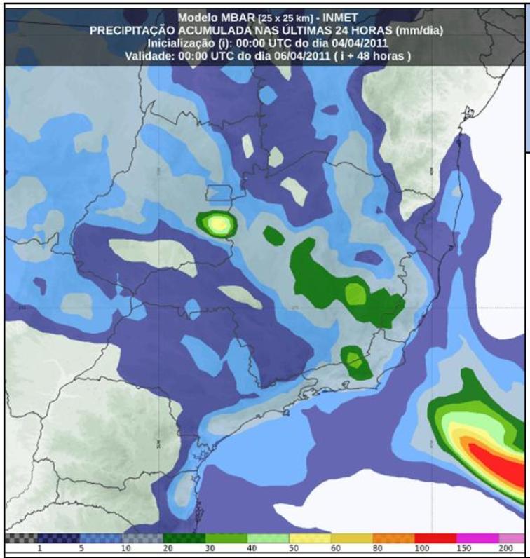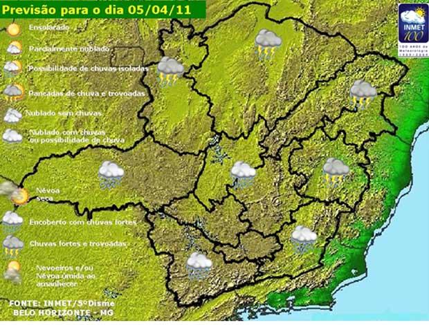 As condições meteorológicas são favoráveis à ocorrência de acentuado volume de chuva em áreas isoladas do Norte, Nordeste, Noroeste, Centro e Leste no período entre 0h do dia 05/04 às 24h do dia 05/04.
