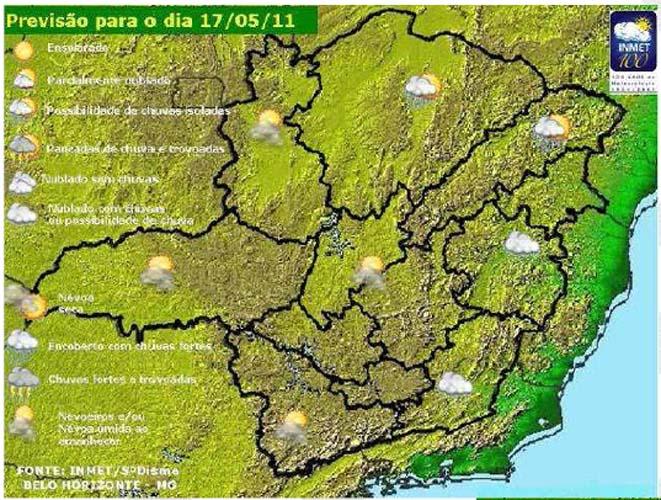 A umidade vinda do oceano também deixa o tempo com maior quantidade de nuvens e ocorrência de chuviscos na Zona da Mata e Leste mineiro. A temperatura deve sofrer um declínio em todas as regiões mineiras em virtude do avanço de uma massa de ar frio polar em direção ao Sudeste brasileiro. Os ventos devem ficar fortes em parte do estado nas próximas 24 horas.