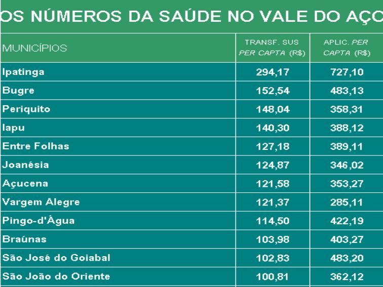 Até por desempenhar a gestão plena, Ipatinga é a cidade que mais investe na área, R$ 727,10 per capita. Apenas no ano passado, Ipatinga aplicou, sozinha, cerca de R$ 174 milhões no sistema de saúde pública. O segundo município que mais investiu por pessoa na área foi Jaguaraçu: R$ 533,71; seguido de Córrego Novo R$ 502,72; São José do Goiabal R$ 483,20; Bugre R$ 483,13; Dom Cavati R$ 453,47; e Marliéria R$ 453,09.