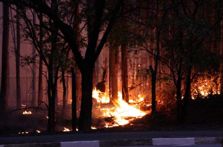 O incêndio, iniciado nas proximidades da rotatória do bairro Iguaçu, entrada para a avenida Brasil, alastrou-se rapidamente no mato rasteiro e seco entre as árvores.