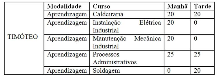 TIMÓTEO A unidade do Senai no município está com inscrições abertas para o seu processo seletivo. Para o primeiro semestre de 2012, são ofertadas 150 vagas para os cursos gratuitos de aprendizagem industrial nas áreas de caldeiraria, instalação elétrica industrial, manutenção mecânica industrial, processos administrativos e soldagem.