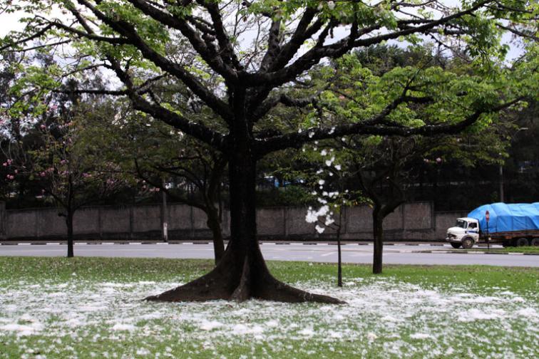 As grandes paineiras existentes no Parque Ipanema e em trevos, como o dessa foto, no trevo do bairro Cariru, pode deixar um tapete branco de paina caída aos seus pés ao fim da época de frutificação.