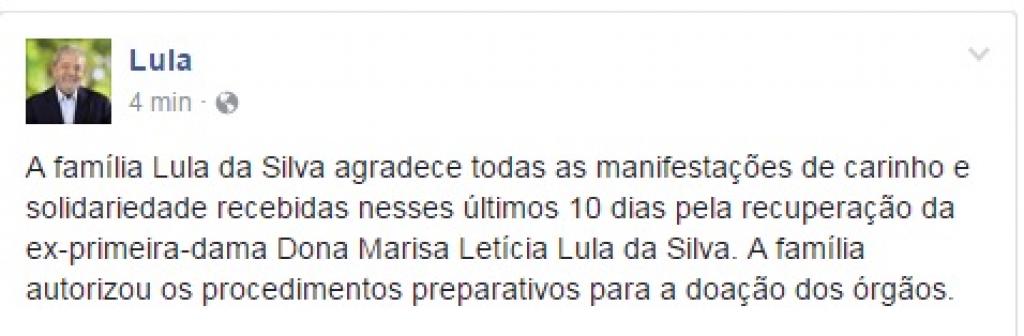 Com base no procedimento, ex-presidente Lula autorizou a eventual doação de órgãos do corpo da ex-primeira-dama