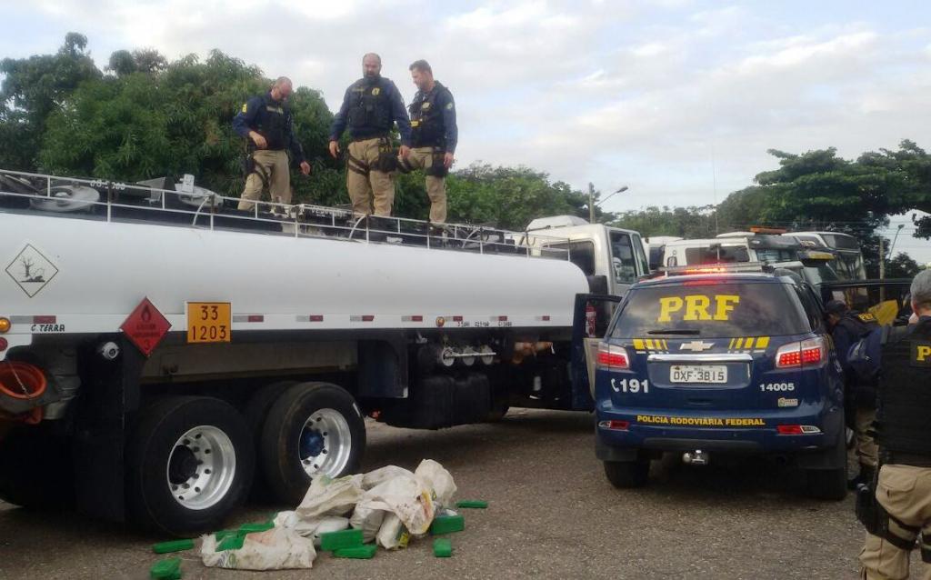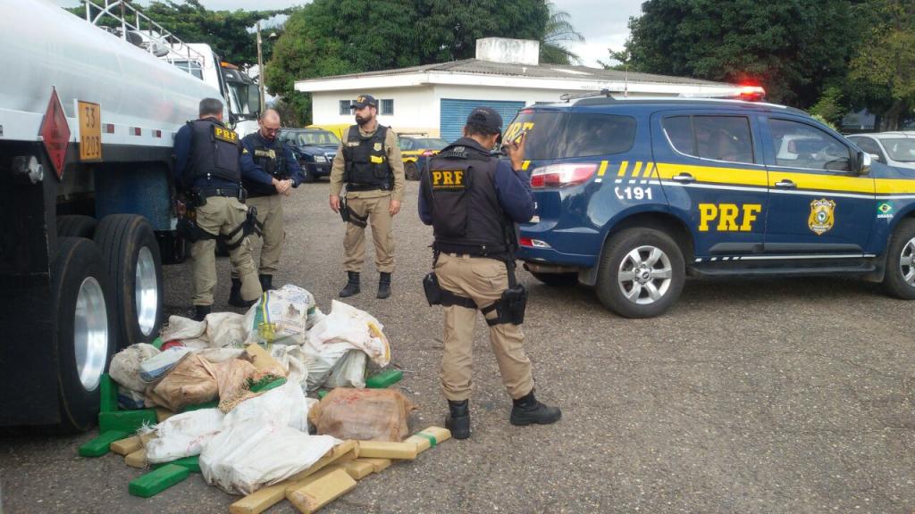 O Grupo Tático da Delegacia Metropolitana da Polícia Rodoviária Federal (PRF) apreendeu, na tarde desta quinta-feira (18), um caminhão-tanque com uma carga de maconha escondida no interior do recipiente que deveria transportar combustíveis.