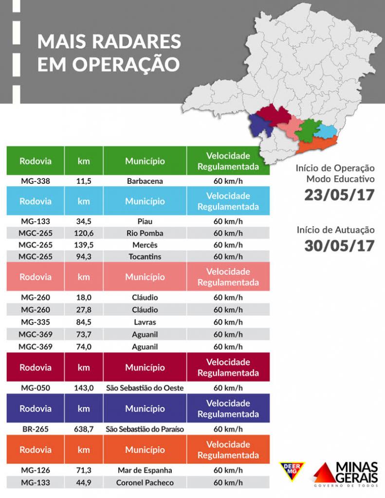 O controle eletrônico de velocidade, por meio da operação de radares fixos, será ampliado para mais 14 novos pontos, em rodovias sob responsabilidade do Departamento de Edificações e Estradas de Rodagem de Minas Gerais (DEER/MG).A partir da próxima terça-feira (30/5), os equipamentos passam a operar de modo definitivo e, consequentemente, a multar os motoristas que ultrapassarem o limite de 60 km/h nos seguintes trechos: