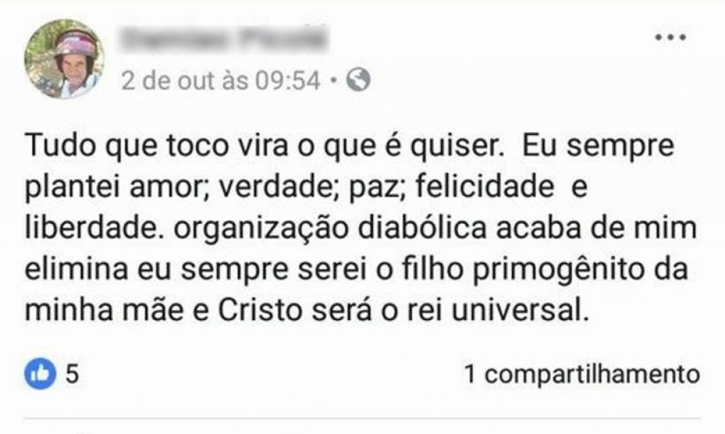 As investigações também colhem dados em uma rede social usada pelo vigia. No dia 2 de outubro ele fez algumas publicações. Em uma delas afirma que "tudo o que toco vira o que quiser". Em outra ele também diz que "sempre plantou amor, verdade, paz, felicidade e liberdade".