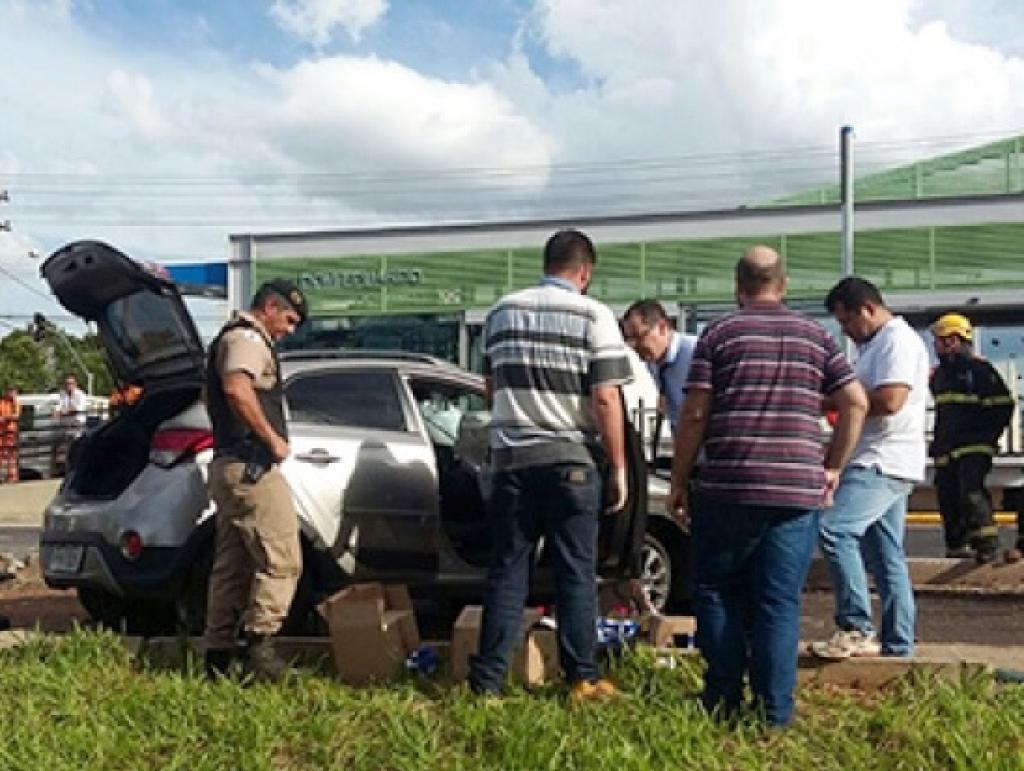 O motorista desobedeceu a ordem de parada dos policiais, que deram início a uma perseguição. Durante a fuga, o suspeito acabou batendo em um semáforo, em outro veículo de passeio e, por fim, colidiu com a viatura. O motorista e mais um casal que estava no carro foram presos.