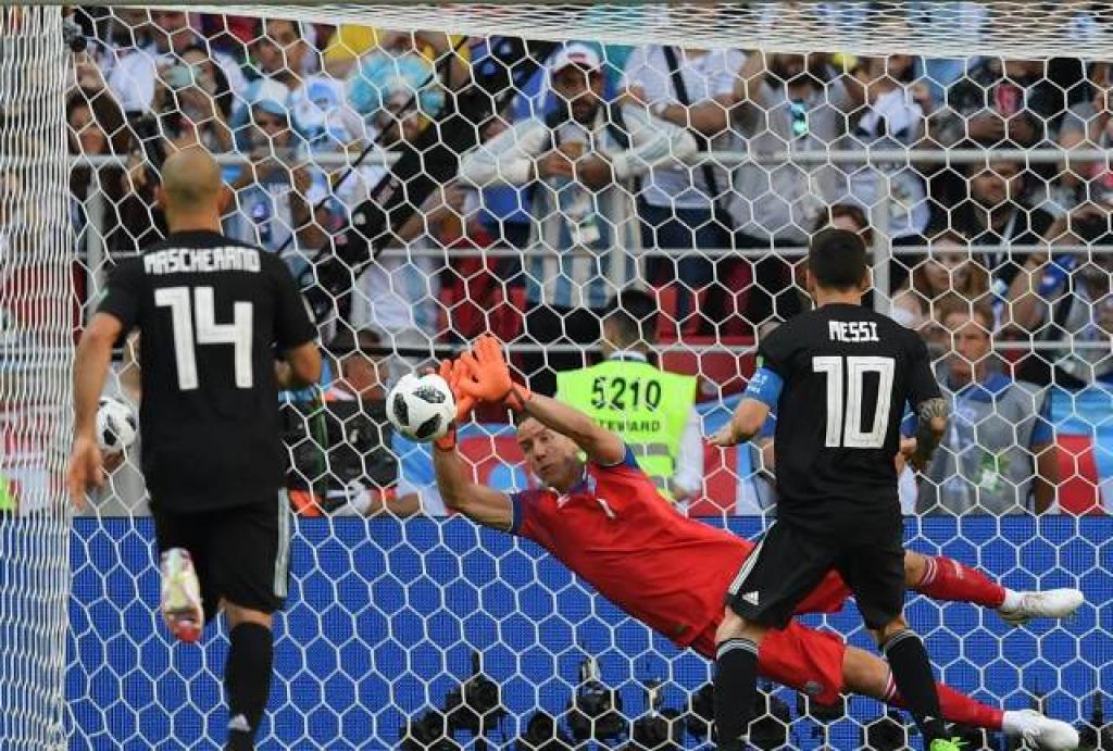 Aos 17min, em nova descida do ataque argentino, Magnússon derruba Meza na área. Messi cobrou o pênalti no canto direito, e foz a vez do goleiro Halldórsson virar protagonista, ao fazer a defesa.