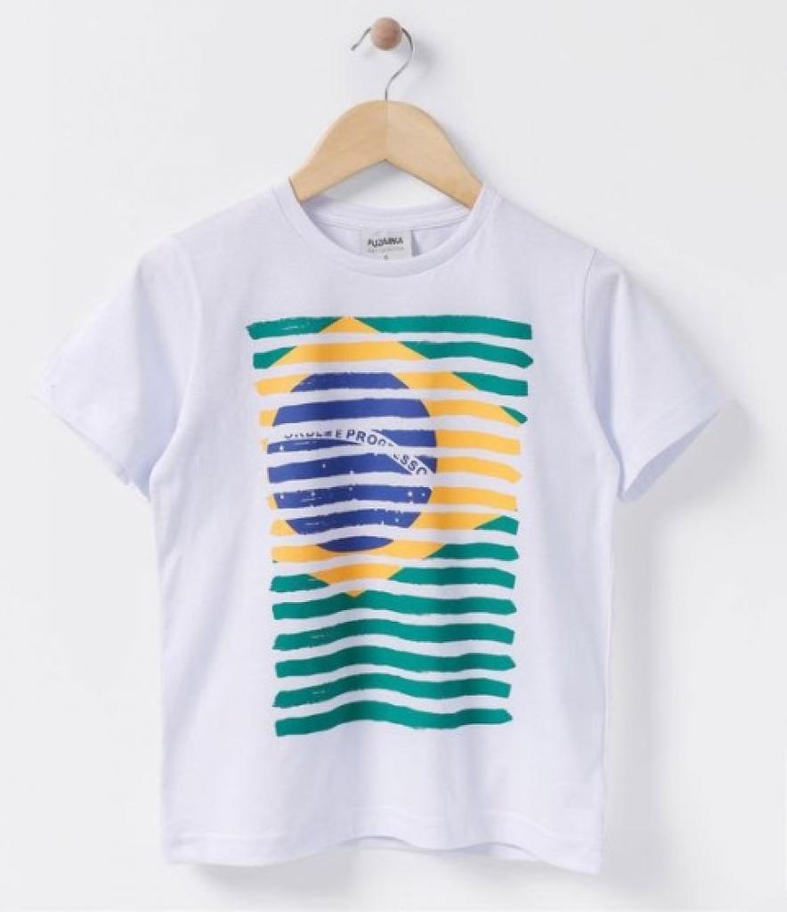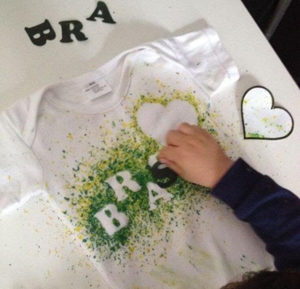 Você tem uma camiseta branca em casa e uma bandeirinha do Brasil? É o que basta para fazer esta camiseta linda e diferente. Recorte a bandeira em tiras e, com uma cola para tecido, cole na camiseta dando espaços entre as tiras.