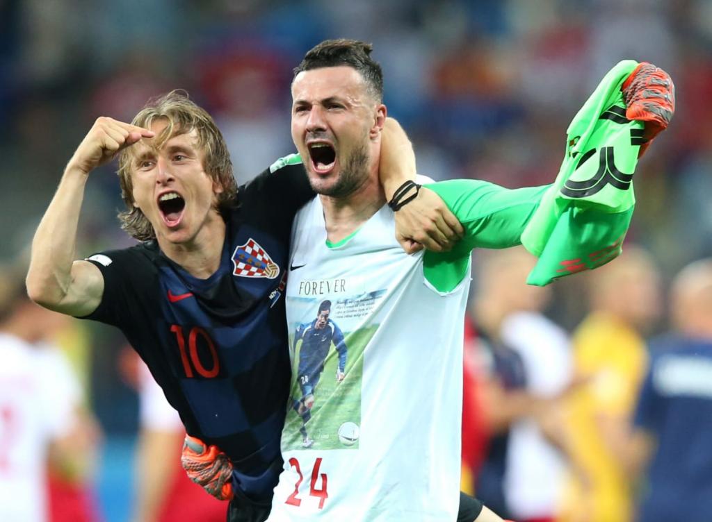 Subasic com a camisa em homenagem a Hrvoje Custic, amigo e colega no Zadar, que faleceu em 2008, depois de ter batido com a cabeça num muro, durante um jogo As duas primeiras cobranças foram defendidas pelos goleiros da Croácia e da Dinamarca. Na quarta cobrança, Subasic evita o gol dinamarquês. A Croácia também desperdiça: Schmeichel faz uma excelente defesa. Na quinta cobrança dinamarquesa, Subasic voltou a defender.