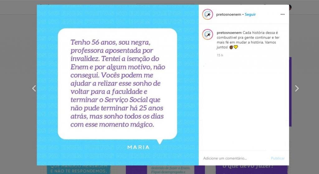No perfil do Instagram do projeto, além de explicar como todo o movimento é tocado, há relatos de quem conseguiu ter a inscrição paga, como o da Maria, de 56 anos, que pretende através do Enem terminar a faculdade de Serviço Social. Sou negra, professora aposentada por invalidez. Tentei a isenção e, por algum motivo, não consegui. Vocês podem me ajudar a realizar esse sonho de voltar para a faculdade e terminar o Serviço Social que não pude terminar há 25 anos atrás, mas sonho todos os dias com esse momento mágico”, comemora.