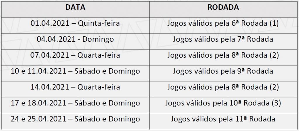 Desta forma, toda a 8ª rodada será realizada no dia 7 de abril. Caso isso não seja possível, a equipe (América, Cruzeiro e Tombense) que tiver seu jogo pela Copa do Brasil designado para o dia 7, fará seu jogo válido pela 8ª rodada no dia 14. Em virtude da paralisação, alguns artigos do regulamento serão alterados para que a fase classificatória se encerre no dia 25.04.2021, as semifinais ocorram nos dias 02.05.2021 e 09.05.2021 e as finais nos dias 16.05.2021 e 23.05.2021.