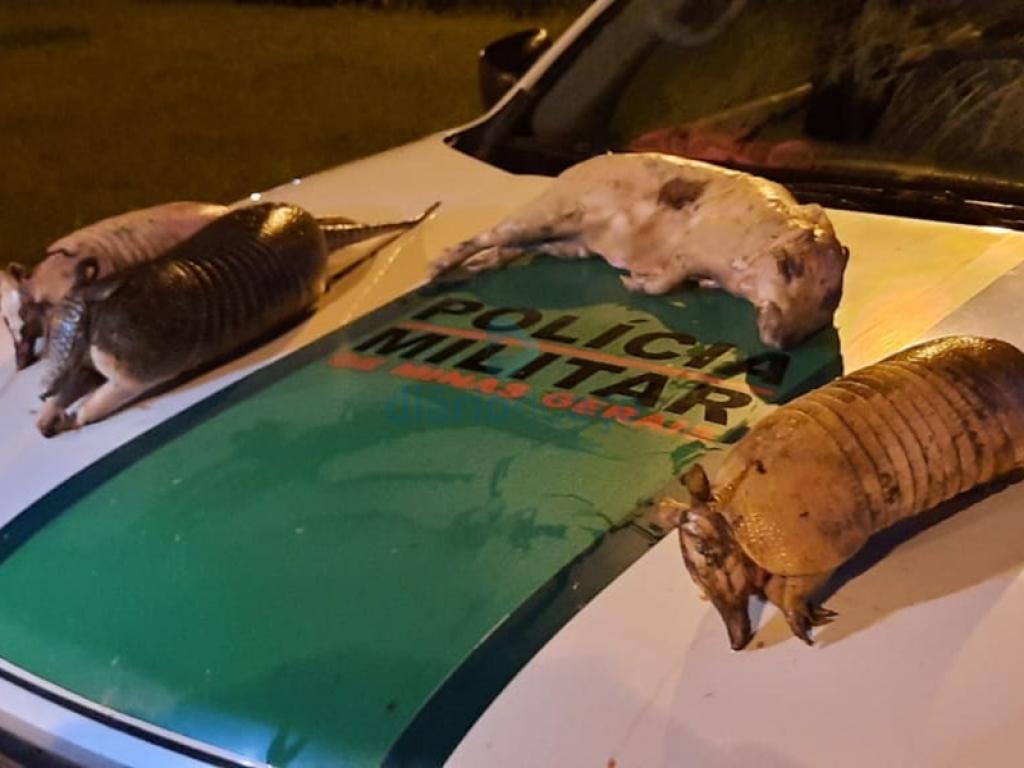 Os três tatus e uma paca que foram encontrados na abordagem da PM de Meio AmbienteUma equipe da Polícia Militar de Meio Ambiente prendeu um caçador com animais silvestres abatidos. O flagrante aconteceu na noite de domingo (11) na região do município de Marliéria, no entorno do Parque Estadual do Rio Doce (PERD).