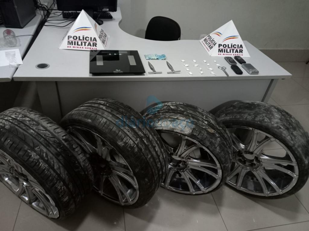 Os policiais encontraram no beco, onde estava o adolescente, quatro rodas de liga leve com pneus, aro 20, uma balança, e três celulares que estariam danificados, além de tesoura e dois furadores de coco para a retirada de água, objetos que podem servir de arma. As rodas, segundo o sargento Ananias, podem ser produto de furto e foram trocadas por drogas no local.