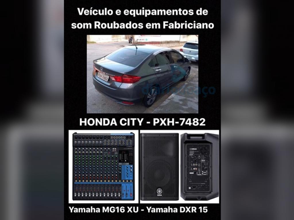 O carro roubado e os equipamentos de som (mesa e caixas acústicas) que estavam no interior do Honda City levado pelos ladrõesPoliciais militares tentam identificar os três bandidos que roubaram um carro e ainda objetos pessoais de duas vítimas, na rua Joaquim Gomes da Silveira Neto, no bairro Júlia Kubistchek, em Coronel Fabriciano. O roubo foi praticado na madrugada desta terça-feira (18) quando as vítimas conversavam no Honda City de cor prata, placas PXH-7482. Além do veículo, foram levados celulares e equipamentos de sonorização.