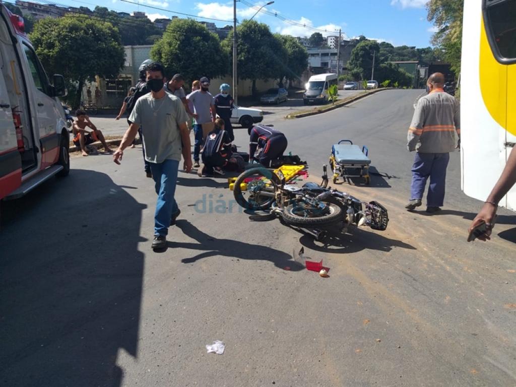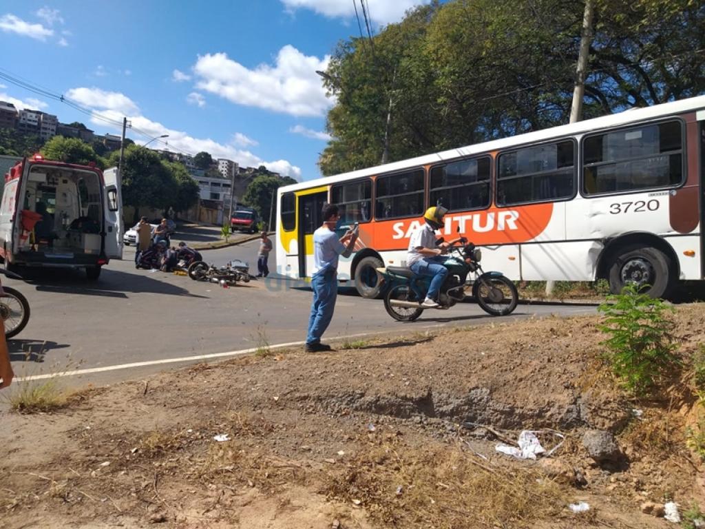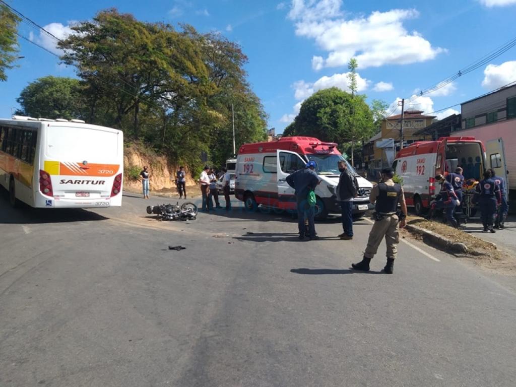 Os profissionais do Samu imobilizam a condutora para ser transportada na unidade de resgateUma mulher ficou ferida no início da tarde desta segunda-feira (7) na colisão da moto dela contra a lateral de um ônibus da Saritur, acidente ocorrido na avenida Colatina, acesso para a avenida Pedro Linhares Gomes (trecho urbano da BR-381), no bairro Caravelas. Além da condutora, saiu ferido o filho dela que estava na garupa da moto Suzuki.