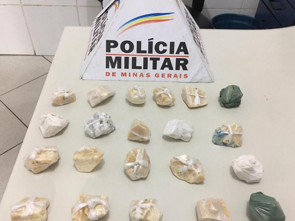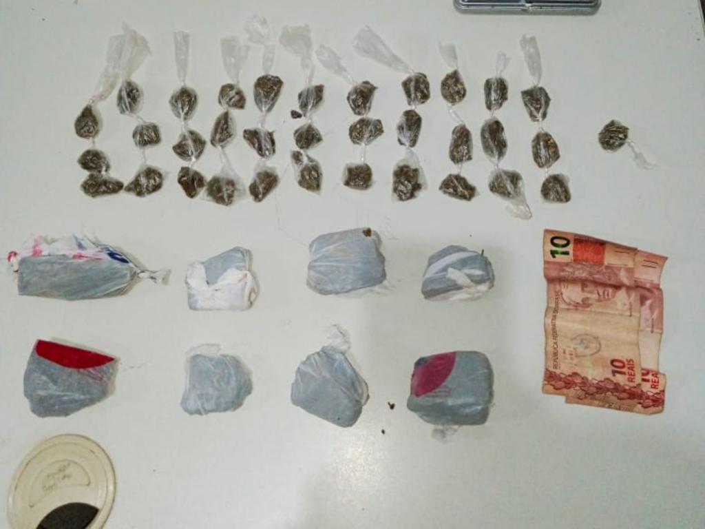 Os materiais apreendidos foram: 8 tabletes de maconha, 34 buchas de maconha, 13 pedras de crack, 1 balança de precisão, R$ 20 em dinheiro.