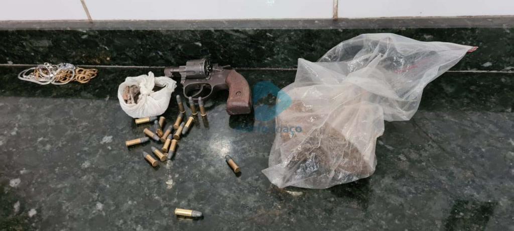 Durante o cumprimento do mandado de busca e apreensão, deferido pelo Juiz da 2ª Vara Federal de Divinópolis, foram encontrados documentos de terceiros com indícios de falsidade e uma arma de fogo calibre 22, sem registro e ainda 18 cartuchos intactos, do mesmo calibre, o que resultou na condução do filho do suspeito, um jovem de 22 anos, à Polícia Civil de Ipatinga. Com a arma os policiais recolheram uma porção de maconha, que o detido disse ser para o seu consumo.
