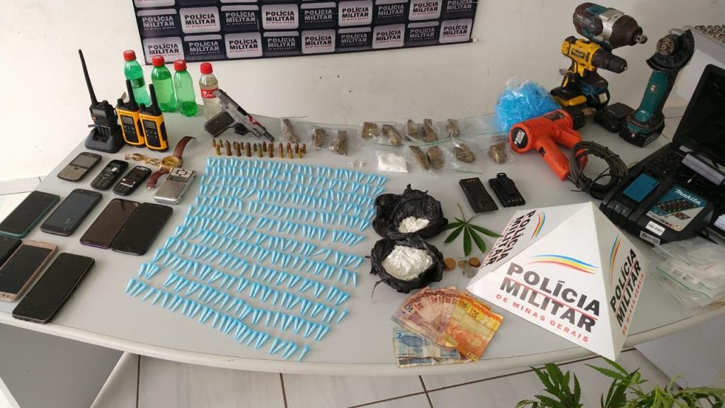 Entre os entorpecentes recolhidos estão 16 tabletes de maconha, 650 pinos e três porções de cocaína, uma planta de cannabis sativa, com a qual se produz maconha, 10 pedras de crack, R$ 194,35 em dinheiro, 11 telefones celulares, um notebook, três radiocomunicadores, dois sacos contendo pinos vazios para acondicionar cocaína, quatro frascos de lança