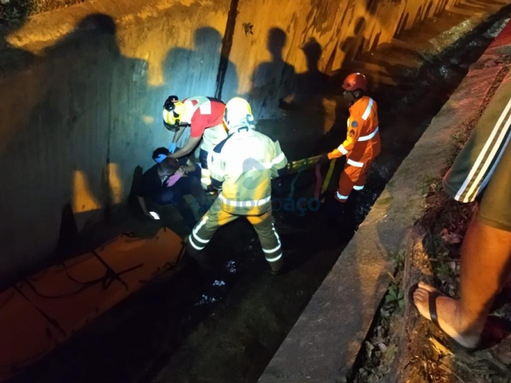 O ciclista Keyvisson Félix Pereira dos Santos, de 19 anos, foi resgatado do fundo da galeria do córrego na avenida José Barcelos, no bairro Vila Militar, em Ipatinga. A vítima perdeu o controle da bicicleta ao colidir com um carro e caiu na galeria, acidente de trânsito registrado na noite de quinta-feira (2).