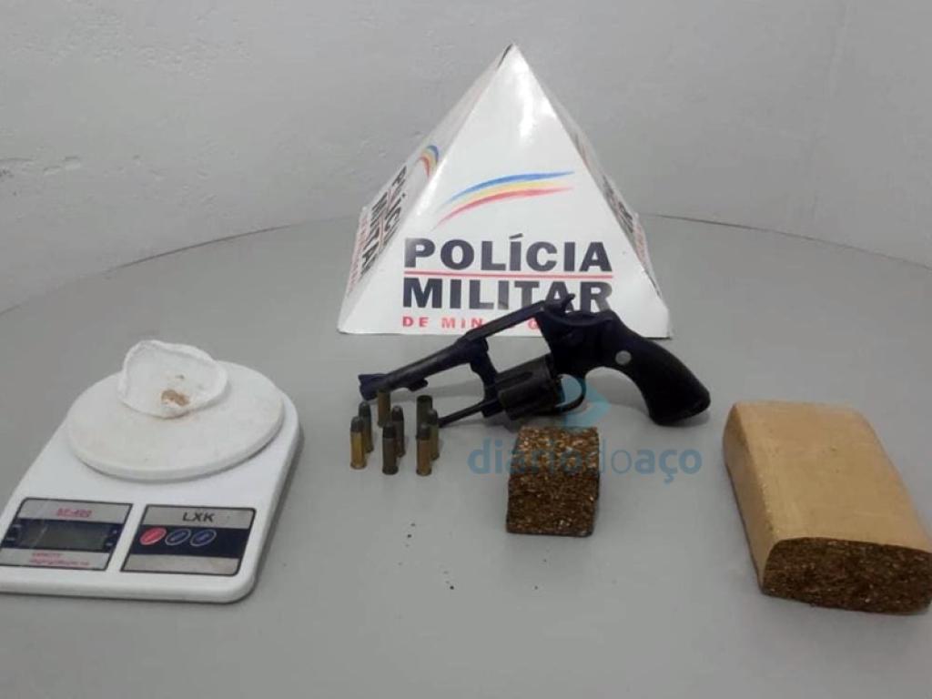Os objetos ilícitos apreendidos depois da abordagem ao suspeitos que estava pilotando uma motoUm revólver calibre 38 e maconha foram apreendidos por policiais militares na madrugada desta segunda-feira (6) depois da abordagem a um motociclista na rua Antônio Geraldo de Moura, no distrito de Perpétuo Socorro, em Belo Oriente. A arma estava na cintura de E.M.S., de 40 anos, e a droga escondida na residência do indivíduo, que foi preso em flagrante.