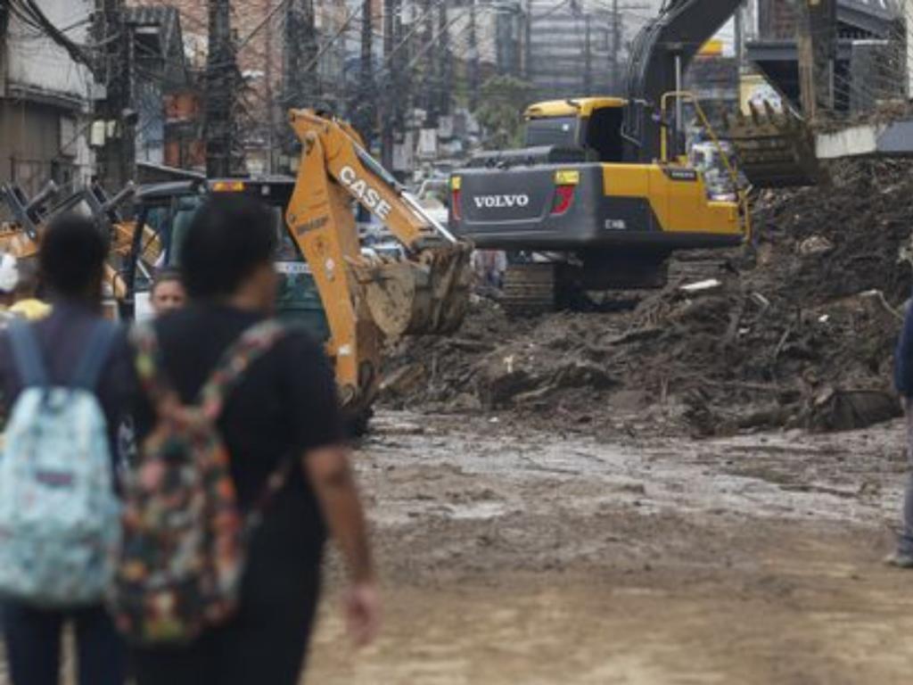 Trabalhos de desobstrução na Rua Teresa, bloqueada pela lama acumulada de deslizamentos de terra durante chuvas em Petrópolis.