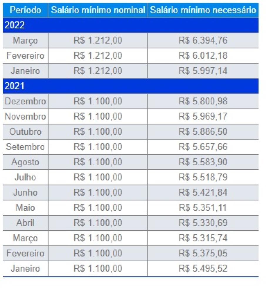 A estimativa do departamento se refere ao mês de março. Em fevereiro, o valor ficou em R$ 6.012,18. De acordo com o Dieese, esse seria o pagamento mínimo para sustentar uma família de quatro pessoas no mês de março no Brasil, considerando gastos com moradia, transporte, alimentação, saúde, educação, vestuário, higiene, lazer e previdência.