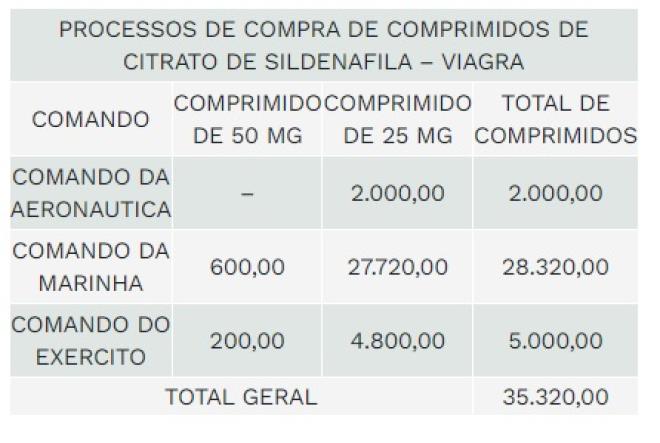 Desde 2020, oito processos de compra foram aprovados e seguem vigentes neste ano. Em sua maioria, os comprimidos são destinados à Marinha, com 28.320 comprimidos. O Exército recebeu 5 mil unidades do medicamento e a Aeronáutica 2 mil. O sildenafila, comercializado com o nome de Viagra pela farmacêutica Pfizer, é um medicamento tipicamente usado no tratamento de disfunção erétil masculina.