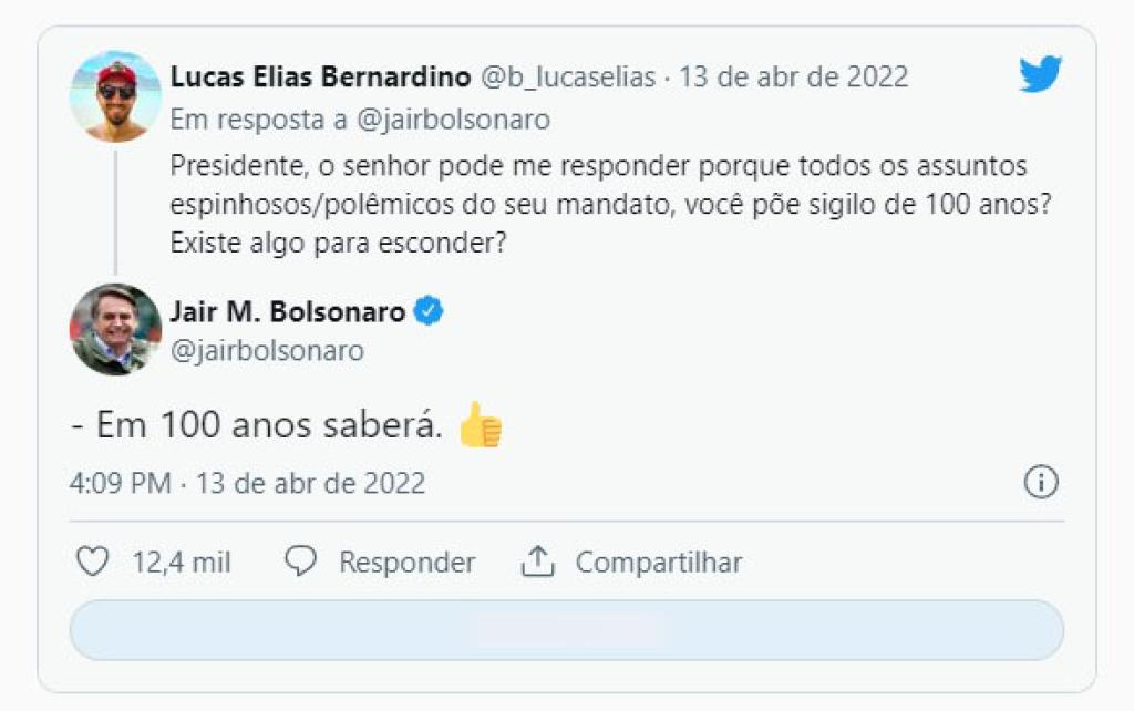 O presidente Jair Bolsonaro (PL) reagiu com ironia ao ser questionado por um seguidor no Twitter sobre o porquê o governo impõe sigilo de um século a assuntos espinhosos, como a carteira de vacinação do chefe do Executivo. Em 100 anos saberá”, respondeu o presidente na mesma rede social.